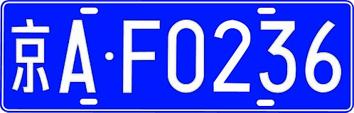 普通民用號牌:首字段為省級行政區劃簡體漢字簡稱(如京、滬等);次字段為二級行政區劃拉丁字母代碼;第三字段為5位阿拉伯數字、拉丁字母混排。