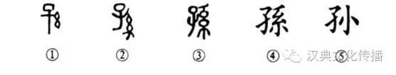 這是“笑看老翁又增孫”的“孫”字。這個字是個會意字。甲骨文①的左邊是“子”,是小兒形,右邊是繩索形。繩索就有系聯之義,也就是說:系于“子”下者就是“孫”。金文②的左上部是“子”,右下部也是繩索之形。③是小篆的形體,其右的繩索之形變成了“系”字,表示系聯,也正是“子子孫孫,無窮匱也”的意思。④是楷書的寫法。⑤是簡化字。