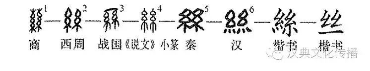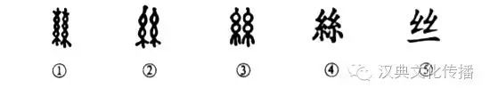 白居易有這樣的詩句:“潯陽地僻無音樂,終歲不聞絲竹聲。”這個“絲竹”的“絲”字就是個象形字。甲骨文①就是兩小把蠶絲扭在一起之形。金文②與甲骨文的形體相類似。小篆③是從金文演變而來的。④是楷書的寫法。⑤是簡化字。