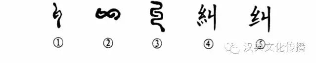 這是“糾纏不休”的“糾”字,本為象形字。①是甲骨文的形體,像瓜蔓或兩股繩索糾纏在一起的樣子。②是金文的形體,更像糾纏的樣子。③為小篆的形體,與甲、金文相似。④為楷書繁體字,增加表意的“系”旁,變成了會意兼形聲的字。⑤為簡化字。