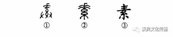 “丹心素節(jié)本無求。”這個(gè)“素”字本為會(huì)意字。①是金文的形體,其中間為白繒(絲織品)之形,下部?jī)蓚?cè)為雙手,是表示雙手執(zhí)白繒。②是小篆的形體,雙手被省掉了,其上部更像繒的下垂形,其下部的“絲”表示白繒是用絲織成的。③是楷書的寫法。