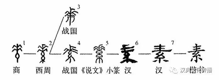 ,會(huì)意。”上舉字形3下部所從之“巿',(古代一種服飾),與從“糸”義通。字之上部“垂”字經(jīng)過隸變,線條拉平直了,變成了三橫一豎,最后形成現(xiàn)在“素”字的寫法。素、索本一字分化。“索”字甲骨文作