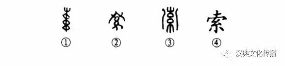 “吾離群而索居。”這個“索”字,本為象形字。甲骨文①就像一條大繩,上端像大繩三股分開的樣子。②是楚帛書的形體,像雙手搓繩的樣子。③是小篆的形體,已發生了訛變。③為楷書的寫法。