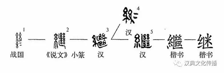 為繼”,此說不確?!胺?img src="/d/file/p/2016/12-19/1482103042_284.jpg" />”仍為“絕”,非“繼”。東漢陳球后碑“繼”字作“継”,魏高貞碑作“繼”。今以“繼”為“繼”的簡化字。《說文》:“繼,續也。”本義是繼續。拍錞蓋:“繼母圼。”《論語·堯曰》:“興滅國,繼絕世,舉逸民,天下之民歸心焉。”引申義有繼承、繼承者、隨后、接濟等。(徐在國)