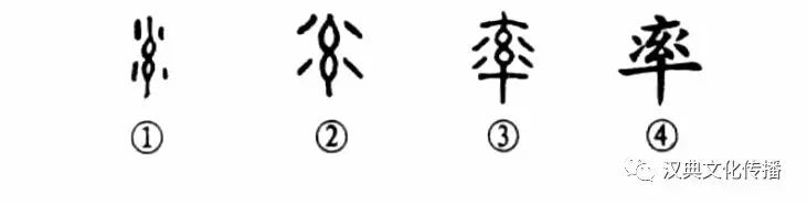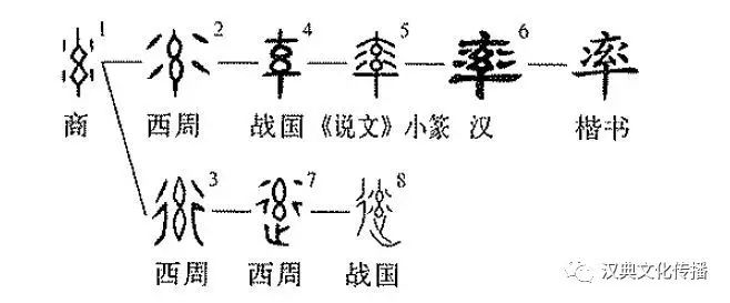 ,后世以加飾筆而旁點不省之形發展至今。西周文字又孳乳出從行、從辵一系,如字形3、7、8,殆強調其表率領、遵從等動作之義。“率”字甲骨文已出現,但不用其本義。“率”的本義當是大索(《說文》謂率的本義為捕鳥畢)。元周伯琦《六書正訛》:“率,大索也。象形。上下兩端象絞索之具,中象索,旁象麻枲之余。”按“率”當是“