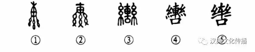 “執轡赴疆場。”這個“轡”字讀作pèi,本為會意字。①是甲骨文的形體,上部是“車”,下部是三條馬韁繩,這就表示這一輛車套了三匹馬。②是金文的形體,與甲骨文相似。③是小篆的形體,由韁繩形訛變為絲,中間一條變為“口”,與“車”相連。許慎說:“軎(wèi),車軸端也?!雹苁强瑫斌w字。⑤為簡化字。