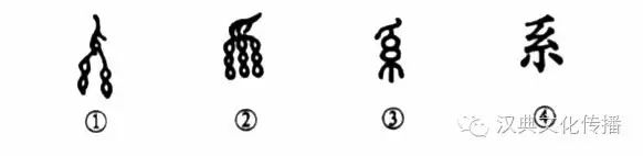 這個“幽情系難解”的“系”字也是一個象形字。甲骨文①的上部是一只手,下部抓著兩縷絲,是掛起來的意思。金文②比甲骨文繁雜了一些,又多了一縷絲,但仍不失懸掛之意。小篆③減掉了兩縷絲,書寫時方便多了。④是楷書的形體,基本上與小篆相同。