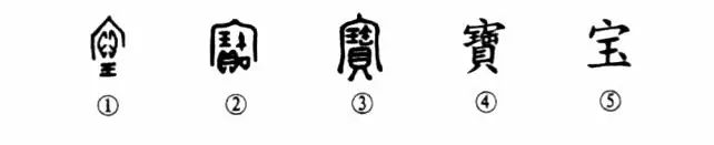 這個“寶”字較復雜。甲骨文①上部是一座房屋,屋內有“貝”有“王”(“王”是大斧頭,代表政權)。這就是說,當時認為有“權”有“貝”是最可寶貴的。可見這是個會意字。金文②又在甲骨文的基礎上增加了“杵”和“臼”之類的舂米用具,這是生活的必需品,所以都是“寶貝”。③是小篆的形體,“王”和“貝”都在,只是把“杵”和“臼”變成了“缶”字。④是楷書的寫法,基本上同于小篆。⑤是簡化字,“宀”(屋)內有“玉”就是“寶”,這就成了一個新的會意字。