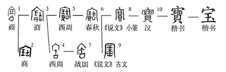 本為會意字。從宀,從玉,從貝。表示屋中儲藏的貝、玉等珍寶。后來加“缶”聲,則成了形聲字。本義是珍寶。《說文》:“寶,珍也。從宀,從玉,從貝,缶聲。”《左傳·襄公十五年》:“我以不貪為寶,爾以玉為寶,若以與我,皆喪寶也。”商代甲骨文中的“寶”為會意字,從商代金文開始,另加上聲符“缶”。在商代,有省去“貝”作“