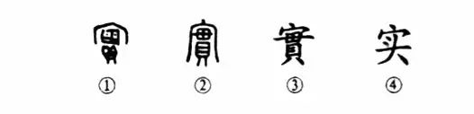 “傳聞之事,恒多失實。”這個“實”字本為會意字。①是金文的形體,其上部為“宀”,即房屋之形,屋內有“貫(錢財)”。②是小篆的形體,與金文形體相似。③是楷書繁體字。④為簡化字。