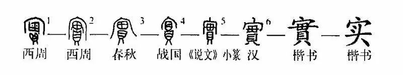 會意字。西周金文有的從宀、從田、從貝,有房有田又有貝(古代貨幣)表示富有;西周金文有的從宀、從貫,“貫”本指穿錢用的繩索,這里指錢。小篆以后沿用了這種寫法。本義是富裕。《說文》:“實,富也。從宀,從貫。貫,貨貝也。”段玉裁注:“以貨物充于屋下,是為實。”《漢書·食貨志上》:“食品貨通,然后國實民富。”引申有財富、物資、滿、盛、充實、堅實、果實、事實,真誠等意義。可通假為“寔”,相當于“是”;還可通假為“至”,讀為zhì。“實”的偏旁“貫”新中國成立后簡化漢字時被簡化為“頭”。(張玉金)