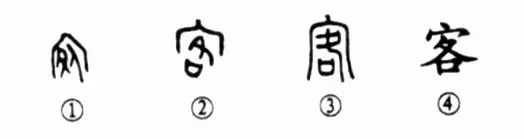 “渭城朝雨淚輕塵,客舍膏青柳色新。”這個“客”字本為會意字。①是甲骨文的形體,郭沫若認為是“客”之古字。上部的外面是房屋之形,屋內右邊有一個面朝左的人,其左邊有一只大腳,表示外人到了的意思。②是金文的形體,房內變為“各(格)”字,為“到達”之義,仍表示外人到了的意思。③是小篆的形體,與金文相似。④為楷書的寫法。