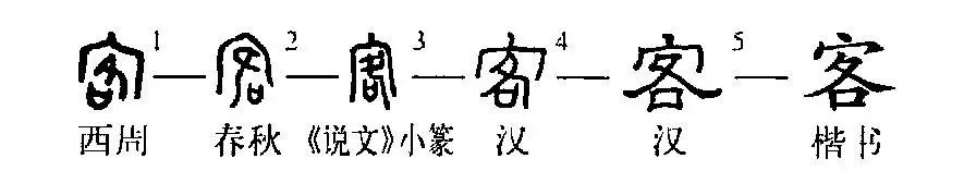 形聲字。從宀,各聲。“客”的聲符“各”,由“夂”(本像人腳形)和“口”組成。“夂”本朝下,到了秦代隸書,開始被橫過來,這樣不便于書寫。所以漢代隸書中角度向下扭轉,以便于書寫。本義是賓客,客人。《廣韻·陌韻》“客,賓客。”《禮記·曲禮下》:“主人敬客,則先拜客,客敬主人,則先拜主人。”引申為顧客、門客、客卿等意義。(張玉金)