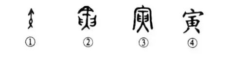 這是“寅吃卯糧”的“寅”字,本為象形字。①是甲骨文的形體,就像一枝箭(矢)形。②是金文的形體,“矢”變得復雜了一些,左右為兩只手,表示用雙手奉矢之形。③是小篆的形體,箭頭訛變成“宀”,完全失去了雙手奉矢之形了。④為楷書的寫法。