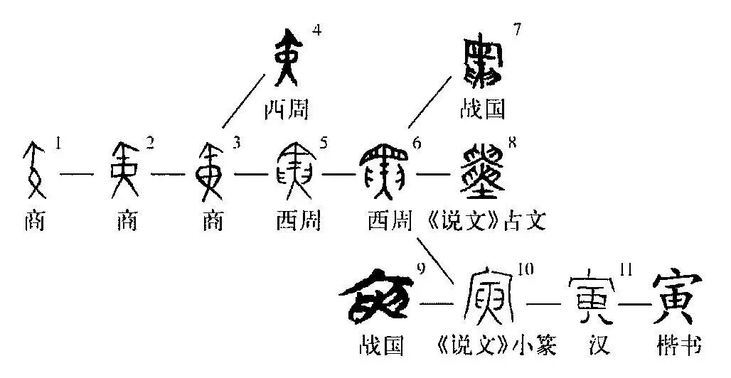 象形字。該字在早期甲骨文中像箭矢形,后又加一框狀形符以與一般箭矢分開,后來中空的方框內部羨出一短畫又訛為雙手,字遂在西周時期呈雙手持矢形;后來矢鏃訛變為“宀”,該字形遂為《說文》小篆承襲。寅字像矢形,其本義為箭矢。矢在弓上,其發必疾,故引申為疾、進。《詩·小雅·六月》:“元戎十乘,以啟先行。”毛傳:“殷曰寅車,先疾也。”鄭玄箋:“寅,進也。”寅又假借為地支字,為地支中的第三位。用于紀月,指夏歷正月;用以紀時,指凌晨三至五時;在太歲紀年法中亦用以紀年,《爾雅·釋天》:“太歲在寅曰攝提格。”與天干相配,可用以紀年,亦可用以紀日。(李義海)