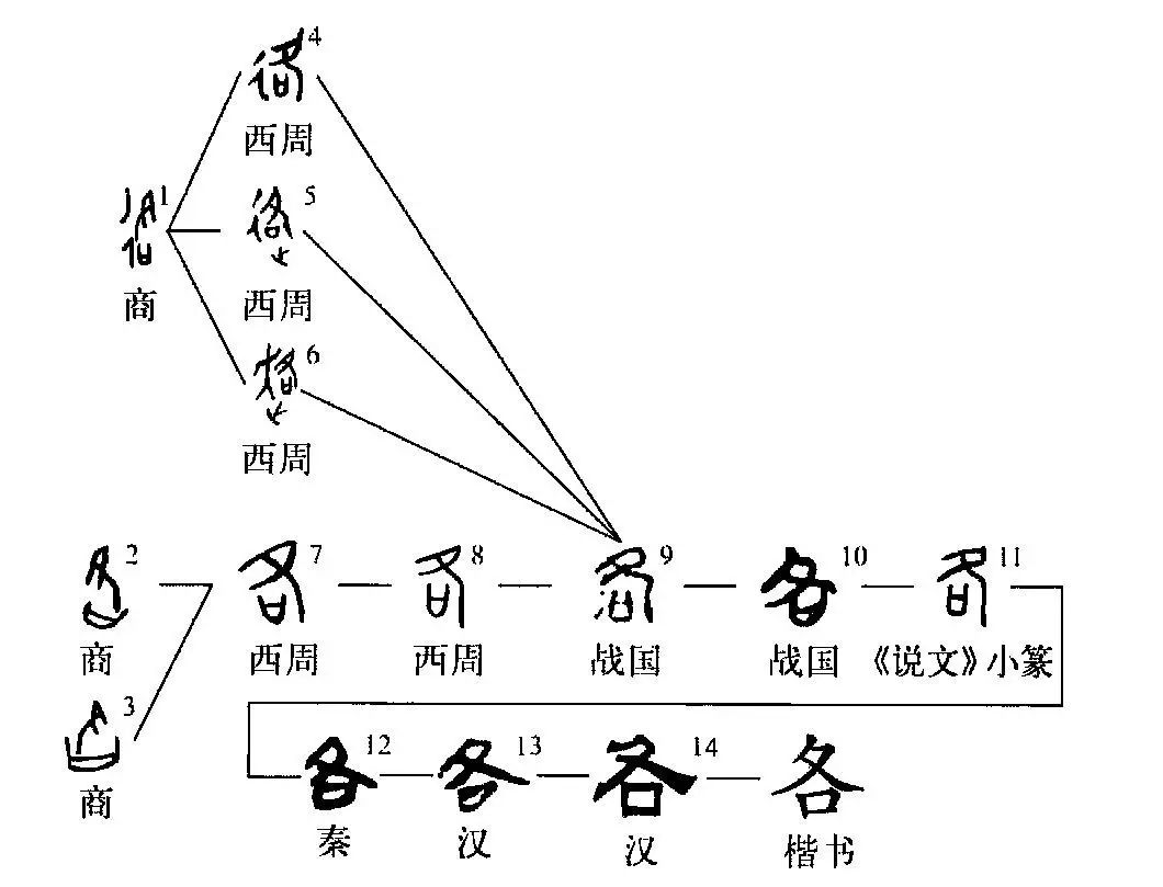 會意字。從夂,像倒趾之形;從凵,像坎穴之形。古人穴居,凵即像其形,以足向居穴以會來至之義。典籍通作“格”。“各”表來至之義,甲骨文因而或加“彳”旁以明行來之義。西周金文中從辵或走。《人》2941:“貞:王其各叀辛,王弗每(悔)?”(貞問:王在辛日來,王不會有災禍吧?悔,悔吝義,即指災禍)曶壺:“王各于成宮。”甲骨文、金文中均使用其本義?;蛴米鳌翱汀保翱汀迸c“各”同源。越王鐘(《集成》144):“我臺(以)樂……大夫、賓各(客)。”或借為“格殺”之“格”。兮甲盤:“各(格)伐獫狁。”此義之“各”,《說文·手部》作“挌”(訓“擊也”),《廣雅·釋詁三》作“??”(訓同《說文》)?!案鳌?,《說文》訓“異辭也”,即今日所說的各自義,此義產生較晚,約出現于戰國時期,如睡虎地秦簡《法律答問》139:“當貲各二甲。”馬王堆三號墓遣策:“鐃鐸各一。”(陳英杰)