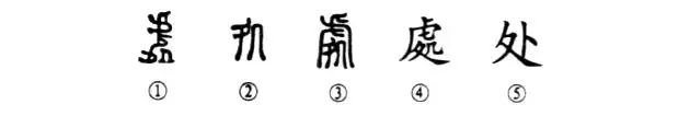 這是“何處望神州”的“處”字,本為會(huì)意字。①是金文形體,像一只蹲踞的老虎形,下部右邊的“幾”形可能是虎足的變形。②是小篆的形體,將金文的“虎”字頭又去掉了。③也是小篆的形體,又增加了“虎”字頭。④是楷書繁體字。⑤為簡化字。