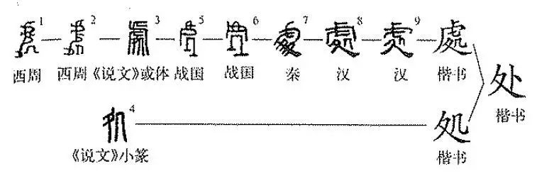形可以認(rèn)為是虍字之繁,也可以認(rèn)為“人”形與“虍”形的合體。因此,西周金文的處字可以認(rèn)為是從人從止(倒止)從幾虍聲。這一形體當(dāng)為處字最早的形體,并為《說文》或體及后來典籍繼承。在戰(zhàn)國時(shí)代處字已經(jīng)簡化為從幾虍聲的字,《說文》篆文“処”當(dāng)是省掉虍聲的形體。漢代隸書的寫法是簡體“処”形體訛變。(周寶宏)