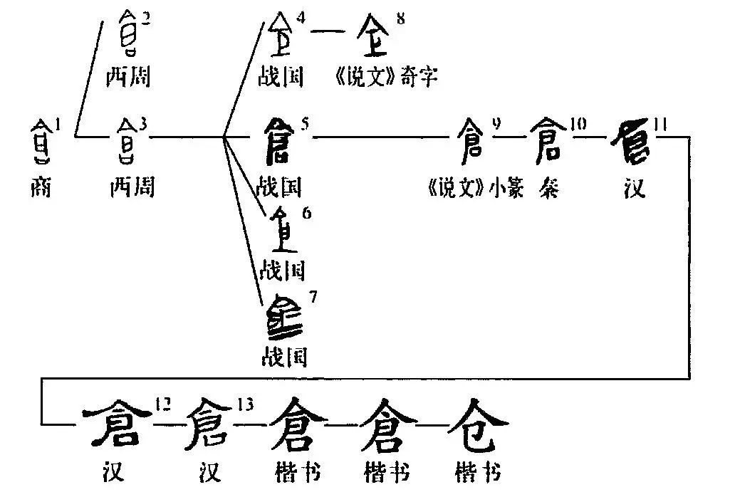 象形字。像糧倉形。頂部像苫蓋;底部像坎穴,古代一些地區倉儲與居住同,常為半地穴式,中部是戶形,即出納之門扇。“倉”字始行于商代,西周與商代初文基本相同,但至戰國,變化紛繁:下底之“口”形多簡變為一橫或二橫,倉門形因書寫草率而作“