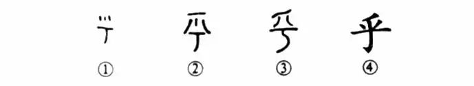 “有朋自遠方來,不亦說(悅)乎?”這個“乎”字與“兮”字相類似,也是個指事字。甲骨文①橫線之上的三點是指事符號,表示說話時氣息或聲音自口中發(fā)出。②是金文的形體,與甲骨文基本相似。只是上部多了一橫。③是小篆的形體。④為楷書的寫法。自古至今一脈相承。