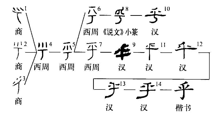 ”只是像聲氣分散上揚之形,并不是獨立的字形。“乎”與“兮”形音義都有關聯(lián),二者是一字之分化,所以《說文》曰:“(乎)從兮,象聲上越揚之形也。”殷商時代的“乎”字上部是三個短畫,以豎畫為主,也有斜畫。至西周中期,短豎平行之態(tài)幾乎消盡,而變作不平行的“