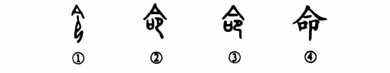 在甲骨文中“令”和“命”同字。你看“命”字,甲骨文①的上部也是一個屋頂(或大傘蓋),下部是一個面朝左跪坐的人在發布命令。可見這個“命”字是一個會意字。金文②的左下角又增加了一個“口”字,這就表示用“口”發布。③是小篆的形體,是由金文直接演變而來。④是楷書的寫法,其右下角的“人”形竟變成“卩”了。