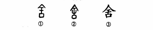 這是“客舍青青柳色新”的“舍”字。我們看金文①的上部就像屋頂(兩面坡),中間的“干”形部分就是頂柱與橫粱,下部“口”即為磚石砌的墻基。由此可見,“舍”的本義就是房屋,亦稱房舍。②是小篆形體,其它各部分均同于金文,僅“干”形的第二橫改為向上彎曲。這不僅美觀,而且也很像廟宇中的斗拱,這樣的房屋是很結實的。楷書③的形體基本上同于金文。