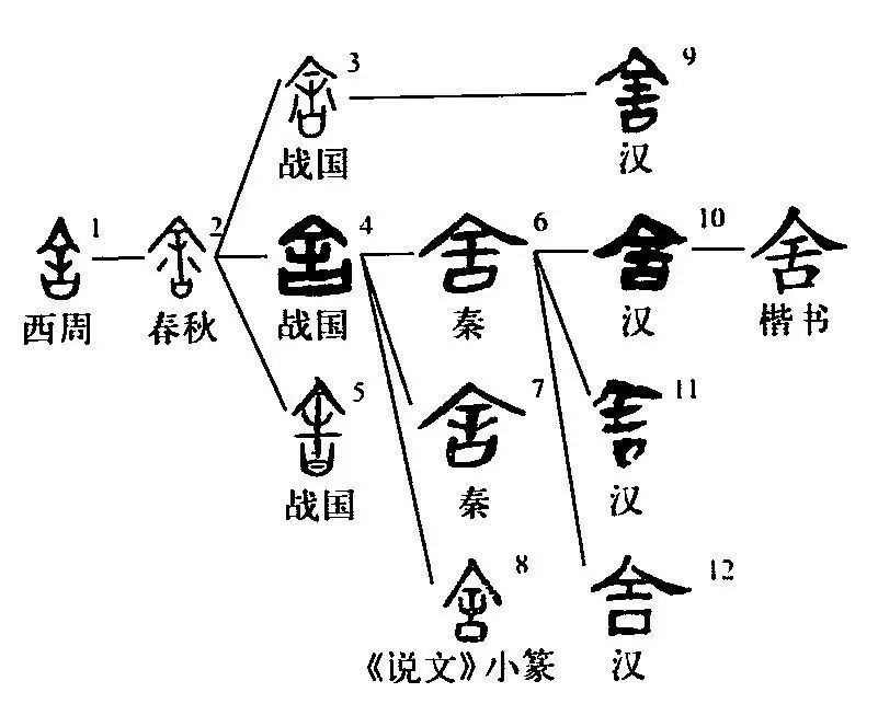”,但都沒能進人楷書規范。本義是口頭發布。《說文》:“市居曰舍。從亼,屮象屋也,囗(wéi)象筑也。”這是據小篆字形而曲解。古文字從口舌之“口”,不從“回幣”形之“囗”。西周善夫克鼎:“王令善夫克舍令于成周遹正八師之年”,“舍命”即發布命令。引申為發出、釋放、施予、給予。《詩·小雅·車攻》:“舍矢如破(放出箭就射中獵物)。”進一步引申為離開、罷止、放棄。以上各義都讀shě。另有以下讀shè的一些意義:由罷止義引申為止息、止宿,由此進一步向多方向引申,軍隊住宿一夜為“舍”,軍行30里而短時休息為“舍”,處所、住所稱“舍”,星次,即星宿運行所至之處稱“舍”。由止息、止宿義還引申為安置、保留。由住所義引申為客館,引申為對自家或親屬的謙詞,如“舍間”“舍弟”。(金國泰)