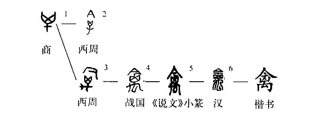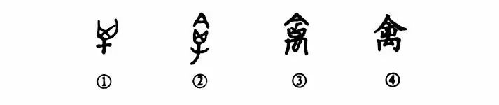 這是“禽獸多出沒”的“禽”字,這個字原為象形字。甲骨文①的上部是個網形,下部是網具的柄,可見“禽”本為捕捉禽獸的工具。②是金文的形體,從象形字變成了上聲(今)下形(網形)的形聲字.反而變繁雜了。③是小篆的形體,變得更為繁雜了,其上部的“今”字與楷書的“今”字有所不同。④是楷書的寫法,基本上與小篆相同。