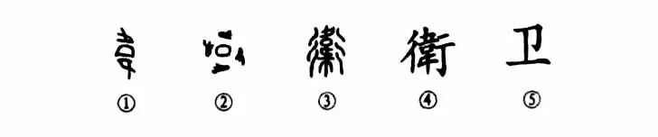 這是“保衛(wèi)”的“衛(wèi)”字的繁體字“衛(wèi)”,是個(gè)會(huì)意字。甲骨文①的上部是腳趾朝左的一只腳,下部是腳趾朝右的一只腳,中間的“口”字形表示一個(gè)區(qū)域或者一個(gè)城市。那么腳步在其周圍循回,就是“保衛(wèi)”的意思。金文②的形體更為形象,中間的圓圈表示區(qū)域或城市,周圍的四只腳真像是哨兵或衛(wèi)士所留下的足跡。這個(gè)金文的形體比甲骨文的形體繁雜了一些。可是到了小篆③更繁雜了,其中間是沿用了甲骨文的形體,左右兩側(cè)增加了個(gè)“行”字,表示這個(gè)區(qū)域或城市四通八達(dá)。同時(shí),這個(gè)“衛(wèi)”字從原來的會(huì)意字變成了外形(行)內(nèi)聲(韋)的形聲字了。④是楷書的寫法,直接由小篆演變而來。⑤是簡化字。