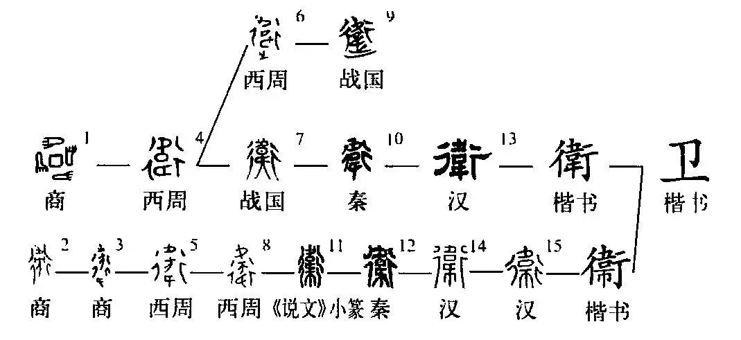 會(huì)意字。《說文》作衞,“宿衞也,從韋、帀,從行。行,列衞也。”甲骨文從四足環(huán)繞著城邑之形,商承祚《十二家吉金圖錄》:“羅叔蘊(yùn)師謂眾足繞口,有守衛(wèi)意。”甲骨文或省去兩邊之足而從行,或?qū)⒈硎境且氐摹翱凇备某伞胺健钡取=鹞幕蛞娤虏繌?fù)增“止”;或“方”變形作“