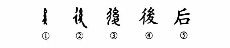 “如積薪耳,后來者居上。“先后”之“后”的本字為“後”,原為會意字。甲骨文①的上部為繩索之形,下部是一只腳趾朝下的腳(止)。林義光說:“足有所系,故后不得前。”②是金文的形體,其左又增加一個表示行走的“彳”,由原來的會意字變成了形聲字。③是小篆的形體,與金文基本相同。④為楷書的繁體字。⑤為被借用的簡化字。