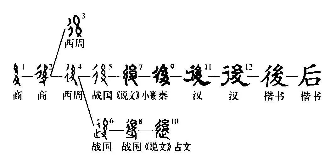 ,像束絲形。攵像倒止形。足有所系,所以遲後。此會意已明,后又繁增彳或走辵旁。攵、彳、辵均表示與行走有關的意義,古文字中通用,也常見累加。金文後字或見從彳,從幺,省去攵。戰國後字的“攵”下或見加一個“口”,如