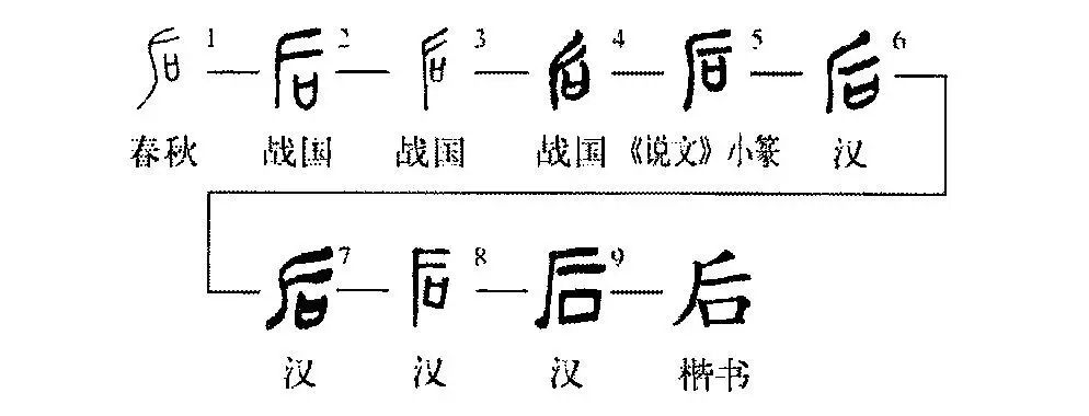《說文》:“后,遲也。”“后”字的本義為“走在后面”的意思,如《論語·先進》:“子畏于匡,顏淵后。”大意是:孔子在匡這個地方被囚禁了,(他的學生)顏淵最后才來。《韓非子·外儲說左上》:“將后齊、燕。”意思是:將要落在齊國和燕國的后面。“后”亦可引申為時間的“遲”、“晚”,如《荀子·修身》:“或先或后。”這是說:有的早有的晚。