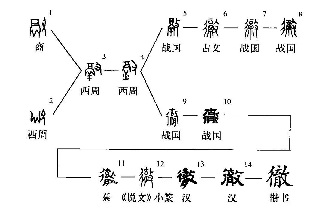 ,訛變甚者則作育之異)、觚育)。有的增加了形旁彳(chì,表道路),有的加彳又加人(亦似幾),或易又(攴)旁為“行”?!墩f文》厘定作從彳從攴從育,是理據重構,與商周構意有別。隸變后楷書作徹,是小篆的筆勢變化,簡化字作徹。個別的或從行從育,或從彳從育從殳,均未取得主流地位。本義當為撤去、撤除(以手撤離鬲?;蛘f為布列,相反相成)。《左傳·宣公十二年》:“諸侯相見,軍衛不徹,警也。”云夢秦簡《秦律十八種·田律》:“禾、芻稾徹木、薦。”(谷禾、芻稾撤除墊木與草藉)此義后用“撤”字。引申指穿、透。《說文》:“徹,通也。”《左傳·成公十六年》:“潘尪之黨與養由基蹲甲而射之,徹七札焉。”又引申指通達(《說文》訓“通”)。何尊:“?(徹)令茍(敬)亯(享)哉。”(通達命令,敬事奉上)亦指貫通,此義秦簡假“