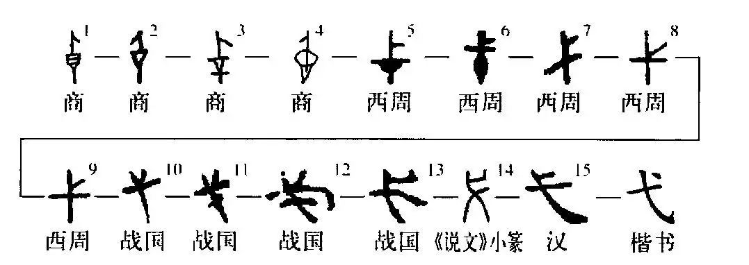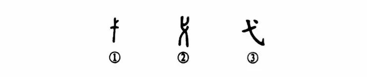 “弋”字讀作yì,是個象形字。①是周朝晚期金文的形體,像一根帶杈的小木樁之形。②是小篆的形體。③是楷書的寫法,看不出木樁的樣子了。