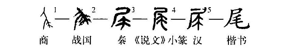會意字。《說文》:“尾,微也。從到(即倒字)毛在尸后。古人或飾系尾,西南夷亦然。”段玉裁注:“微,當作,妝,細也。此以疊韻為訓。如:門,捫也,戶,護也之例。《方言》曰:尾,盡也;尾,梢也。引申訓為后。《后漢書·西南夷列傳》曰:‘槃瓠(盤古)之后,好五色衣服,制裁皆有尾形。’按尾為禽獸之尾,此甚易解耳,而許必以尾系之人者,以其字從尸。人飾系尾,而禽獸似之。許意如是。”段注不明白《說文》所說古人或飾系尾之義,但從商代甲骨文看,尾字形體確為人系一尾形,至于甲骨文之尾字的用法卻不詳,為什么人系一尾形也不清楚,但足以證明商代確有系飾尾之事,《說文》所說確有實據。從甲骨文尾字形體看,尾字的本義絕不是禽獸之尾,恰是人飾之尾,引申為動物之尾。(周寶宏)