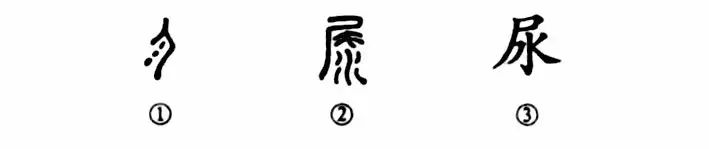 這是個“尿”字,也是一個會意字。甲骨文①是一個向左側立的“人”,向左射出的三個點兒是表示“尿”。這就表明這是一個男人在站著尿尿。小篆②反而變得復雜化了,變成了“尾”字下再加“水”。③是楷書的形體,把小篆中的“毛”字去掉了。