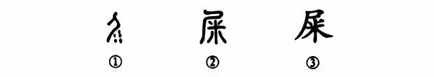 “屎”字是個會意字。甲骨文①實在形象,面向左側立的一個“人”,在臀部之后有五個小點兒,這就是人拉的屎。小篆②的上部“尸”也是人形,下部寫作“米”,這說明人的“屎”是由“米”經消化以后變成的。③是楷書的寫法,是由小篆直接演變而來。