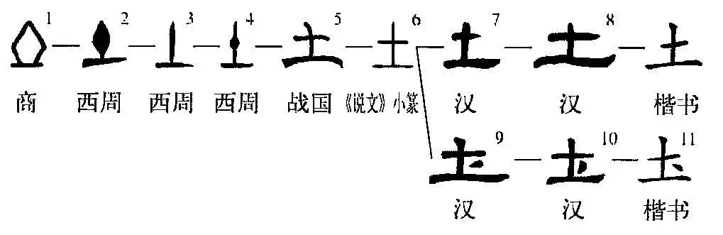 形,更為形象。后土堆之形或寫作一豎畫,或在豎畫上加一點。所加之點拉伸為一橫,便成為此字后來規范的寫法。9、10、11三字形顯示在西漢和近代的文字中,有在旁加點的異構。顧藹吉說:“土本無點,諸碑士或作土,故加點以別之。”“土”的本義指土壤。《說文》:“土,地之吐生物者也。”《書?禹貢》:“(徐州)厥貢惟土五色。”引申為土地、疆土、土田等,又引申為鄉土、本土,由鄉土、本土引申為與“洋”相對的土氣、俗氣等。“土”又是“社”的古文,甲骨文亳土、唐土等皆指其地之土地神,即社神。“土”又特指“水火木金土”五行之一。又特指古代塤類土制的樂器。“土”讀“dù”,通“杜”。根。《詩?豳風?鴟鸮》:“徹彼桑土,綢繆牖戶。”毛傳:“桑土,根也。”陸德明釋文:“土,音杜。《韓詩》作‘杜’,義同。”(林志強)