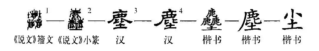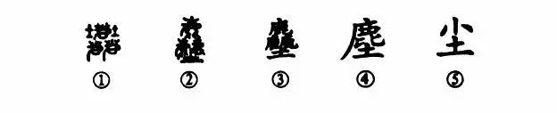 這個“爺娘妻子走相送,塵埃不見咸陽橋”中的“塵”字是個會意字。①是“塵”字的籀文形體(見《說文解字》),其中有三只鹿,在上面一只鹿的兩側(cè)是兩個“土”字,這就表明群鹿奔跑,塵土飛揚(yáng),可見這是個會意字。小篆②則減少了一個“土”字,把余下的一個“土”移到三只鹿的腳下,這就更為形象地表明了群鹿奔跑揚(yáng)起塵土的意思。楷書③是直接由小篆變來的,但筆畫太多,所以后來又減少了兩個鹿,變成了楷書④的形體。⑤是新簡化的會意字,“小土”謂之“塵”,這是很有道理的。