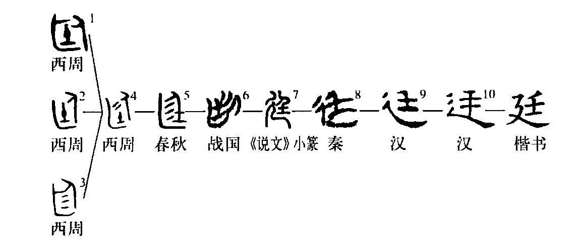 “督撫廷推,九卿共之?!边@個“廷”字,原為會意字。①是金文的形體,左邊的曲線表示庭院,院中有“土”,右邊是面朝左站立的一個人。②是小篆的寫法,“土”移于人下。③是楷書的寫法。