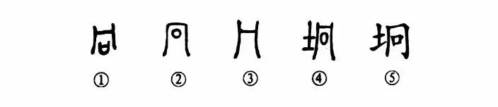 這個“坰”字讀作jiōng,本為象形字。①是金文的形體,是一面開口的區界形,中間的“口”表示京都所在,這就是表示京都的遠郊;②是《說文》中的古文形體。③是小篆的寫法,中間的“口”沒有了。④也是小篆的形體,在金文形體的左邊又增加表意的“土”旁,變成形聲字了。⑤為楷書形體。