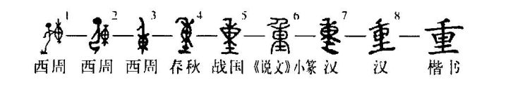 會意字。初文(如字形1)像一人身后背負盛得滿滿的囊橐,用以表示沉重義。后將形體進行并劃性簡化,即將人形豎畫和囊橐的象形文中的豎畫公用,使人形和囊橐形并和為一體,成為字形3那樣的形體。春秋以降,下面又增加了土旁。漢隸平直筆畫,人形和囊橐形全失。《說文》:“重,厚也。”段玉裁注:“厚斯重矣。引申之為鄭重、 重疊。”表厚重、沉重義,讀zhòng。引申之則為重大、重要、重視、重量、重任、重托等。重疊義,讀chóng。引申之則有重復、重逢、重合、重霄、重圍等。(董蓮池)