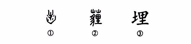 這是“落紅埋幽徑”的“埋”字,是個(gè)會(huì)意字。甲骨文①的形體多形象啊!其下部的曲線表示挖了一個(gè)土坑,中間是“牛”(正面看牛頭之形);在“牛”的兩側(cè)有四個(gè)點(diǎn)兒,這就表示填的土,其意就是把牛埋于地下。小篆②在形體上發(fā)生了很大的變化,其上部是草,其下是“貍”(貍),后者是一種動(dòng)物,藏在草中就是“埋藏”之義。到了楷書(shū)③則又變成了一個(gè)筆畫(huà)簡(jiǎn)單的后起會(huì)意字,其左是“土”其右是“里”,把東西藏在土里,當(dāng)然就是“埋”的意思了。