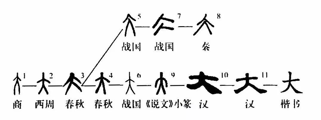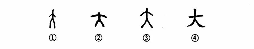 這個“大”字是個象形字。甲骨文①、金文②、小篆③都像“人”形。楷書④則把人的兩臂伸平變成了一橫,這樣“大”字就不像“人”形了。