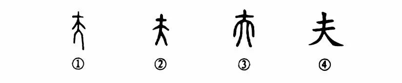 “使君自有婦,羅敷自有夫。”這個“夫”字是個象形字。甲骨文①的下部是“大”(就是正立著一個人),“大”的上部有一小橫,表示頭簪形。這就是說:“以簪束發”,人已長成。②是金文的形體,與甲骨文類似。③是小篆的形體,其下部變得不像“人”形了。④是楷書的寫法。
