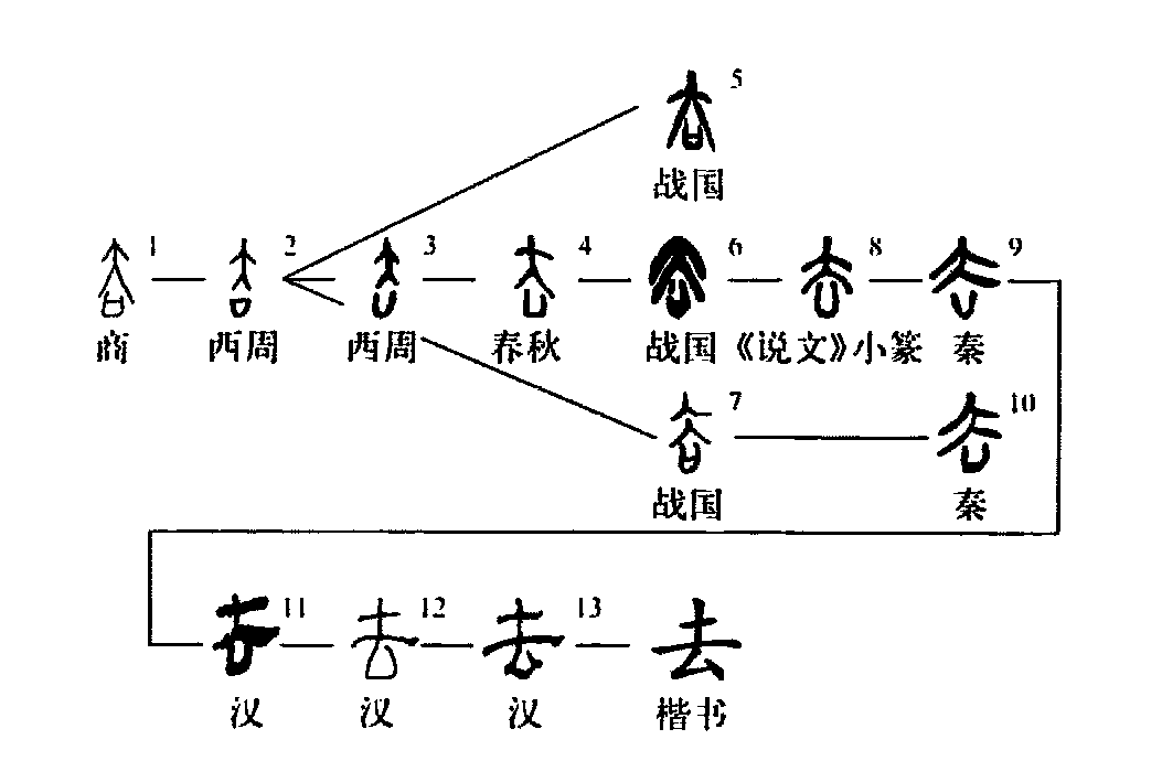“去”字可能有兩個來源。其一,象形字。像盛器,下體之“口”像器,上體之“大”像蓋兒,是“凵盧”(????)一詞的象形初文,本義是有蓋兒的盛食器(參見“凵”字條)。其二,從大從口,結構之意不明,詞本義未知(學者或視作以“開口”為義的“呿”字初文)。以上二字在商周時代已經混同一形。至西周中期,二元混同的“去”字下體“口”已多省去上橫而成“凵”形,至東漢,變作三角形,進而變作“厶”形。“去”字上體的“大”形,在戰國楚系文字里中豎訛斷,成為上下相疊的兩個“人”形,這在秦簡及西漢馬王堆、銀雀山簡帛中都有表現,但秦后隸變的主流形式是把“大”形變作“土”形。《說文》:“去,人相違也。”違離、離開義使用頻率高,占據了混同合一的“去”字。《詩·大雅·生民》:“鳥乃去矣,后稷呱矣。”由離開的使動義引申為去掉、除去。由離開義還引申為放棄、失掉和距離,引申為往,即離開此地而至于彼地。而以盛食器為義的“去”在漢代字書和詞書中寫作加“竹”標義的“??”,典籍上一般用后起形聲字“筥(jǔ)”。《詩·周頌·良耜》:“或來瞻女(汝),載筐及筥,其餉伊黍。”引申為收藏,后來用增從“廾”的“弆”字。另引申為器蓋兒,用增從“皿”的“盍”字(參見“盍”字條)。(金國泰)