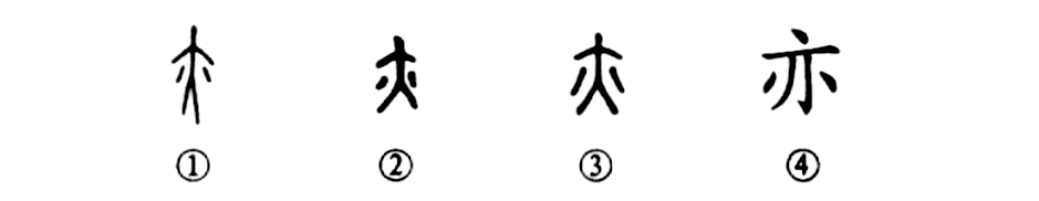這個“亦”字是個典型的指事字。甲骨文①是正面立著的一個人,兩臂之下的兩個點兒就是指事符號,表示這里就是腋下。金文②也是這種形體。小篆③與甲金文字一脈相承。④是楷書的形體,中間的“人”形變得根本不像了?!耙唷弊值谋玖x是“腋”(上古沒有“腋”字)。但因為后世“亦”字被假借為虛詞用了,其義大致相當于現代漢語中的“也”字,“亦”字當“腋”講的本義就只好重新造一個新的左形(月即肉)右聲(夜)的形聲字“腋”來代表。從此,“亦”與“腋”有了明確的分工,“亦”字只作虛詞用,而“腋”字就代替了“亦”字的本義。