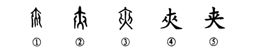 這個“夾”字是個會意字。甲骨文①中間是一個大人,左右兩個小人攙扶這個大人。金文②的形體也基本上同于甲骨文。小篆③左右的兩個小人,已變得很小了。④是楷書的形體,是直接由小篆演變而來的。⑤是草書楷化的簡化字。